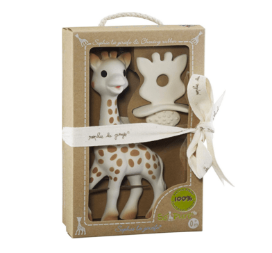 If you grew up in France like I did, you’ll most likely remember having chewed and relieved your aching growing teeth on “Sophie, La Girafe“– The Giraffe’s neck. ( well, you may remember Sophie anyway if you don’t remember teething) Sophie La Girafe is a 100% rubber teether made by the French toy manufacturer Vulli since 1961!