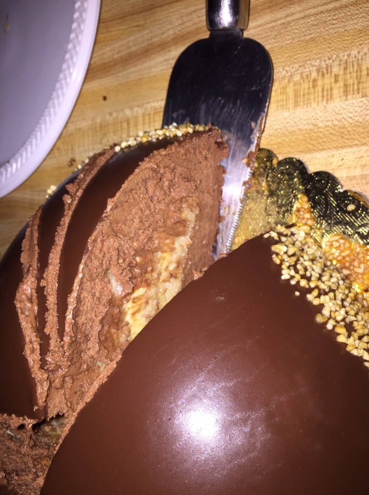 So for the occasion, my daughter and I took a festive stroll there and walked into Main Street Bakery to pick up a French birthday holiday cake. I had taken a peek at the website beforehand and I knew it was too late to order, but I had my eye on this fabulous looking cake called ” La Bombe” filled with chocolate ganache and almond paste and took a chance.