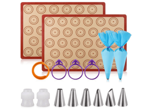 To make your experience easier still make sure you grab all the essentials to make your macaron such as the Silicone Macaron Baking Mat Kit with pipping bags. (30 in 1) Macaron Baking Mat Heart Set,2 Half Sheet Macaron Silicone Mat,1 Egg Separator,1 Pastry Brush,1 Spatula,6 Frosting Tips,12 Piping Bags