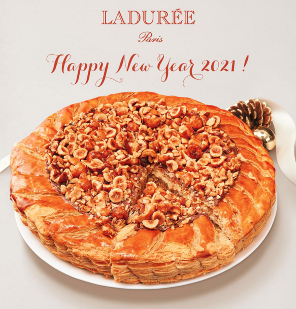 This year for the 2021 Epiphany Galette des Rois or King’s Cake, Ladurée presents its Signature Gourmet Galette: crispy golden puff pastry, French-sourced almond and hazelnut cream filling with white chocolate shavings. Topped with a chocolate and caramelized hazelnut tuile.