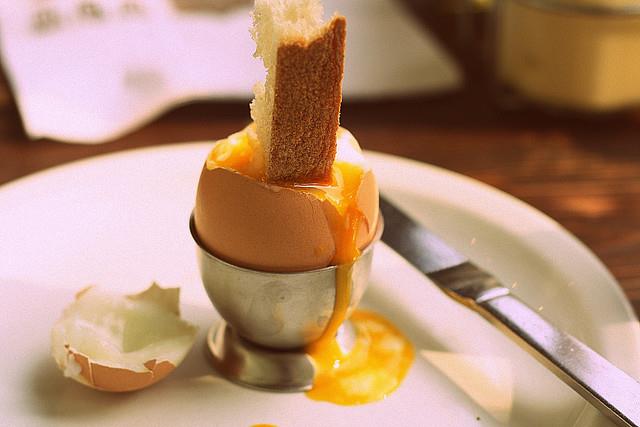 Enjoy au naturel or with a few sprinkles of salt and pepper and some butter on the bread of course! An Oeuf à la coque is basically a 3-4 minute soft-boiled egg that is eaten with strips of French bread or “mouillettes” dipped in the egg.