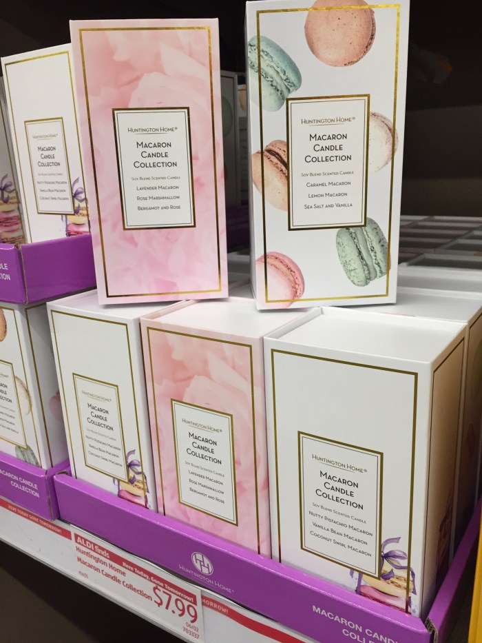Spotted this week at Aldi in North Texas: French Macaron Candle Collection by Huntington Home. These French Macarons smell heavenly of salted caramel, vanilla, and coconut and are boxed in a beautiful reusable gift box. They look and smell good enough to eat but unfortunately, these macarons are not eatable they are candles. They come in three sets and each set is a trio of macarons in a colored glass jar shaped like a macaron in delicious flavors and aromas: Caramel, Sea Salt, and Lemon or Lavender, Rose Marshmallow, Bergamot & Rose, and finally Nutty Pistachio, Vanilla Bean, Coconut Swirl. The price is $7.99 for a box of three BIG colored glass macaron shape candles made with a soy blend. Here today, gone tomorrow!