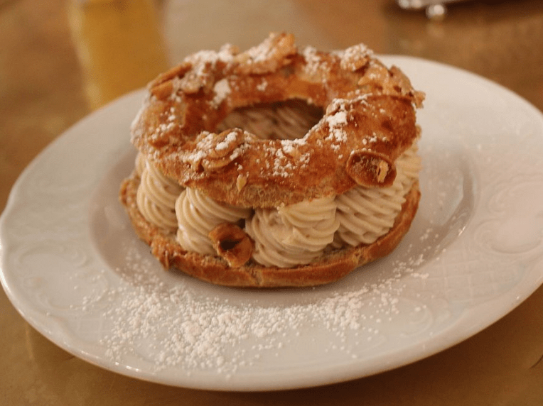 A Paris–Brest is a French dessert, made of choux pastry and a praline flavored rich cream. This round pastry looks like a wheel and was created to commemorate the Paris-Brest-Paris bicycle race in the 19th century.