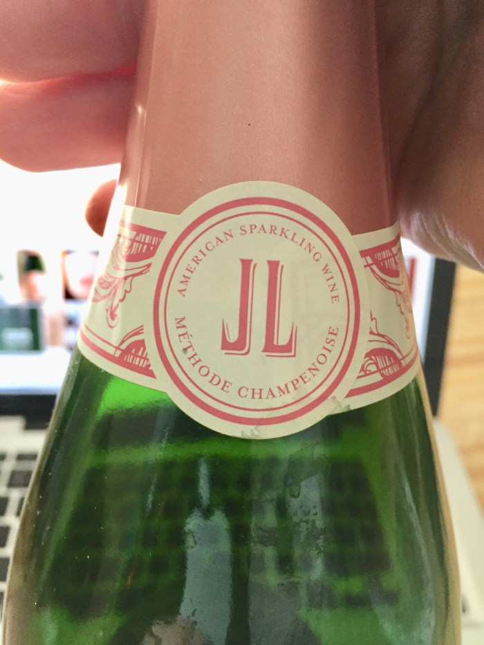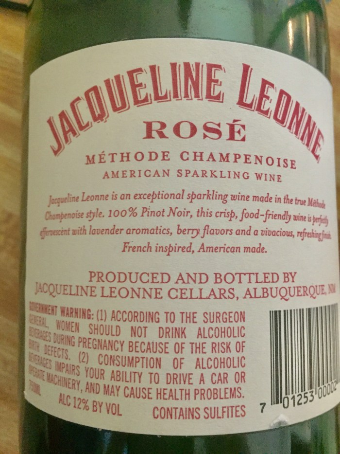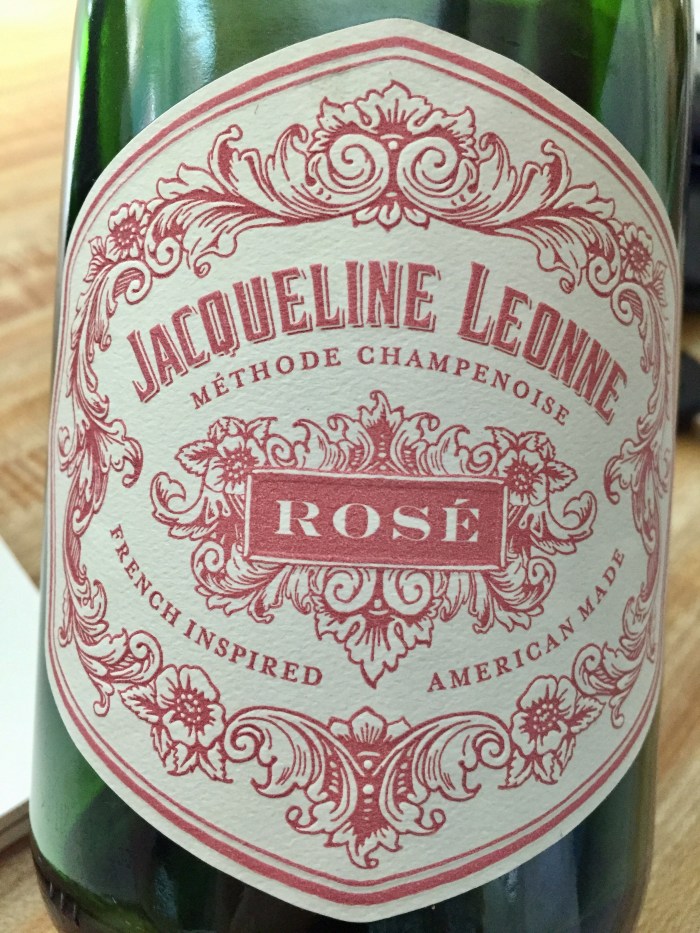 The label reads: “Jacqueline Leonne is an exceptional sparkling wine made in the true Méthode Champenoise style. 100% Pinot Noir, this crisp, food-friendly wine is perfectly effervescent with lavender aromatics, berry flavors, and a vivacious, refreshing finish. French-inspired, American-made.”