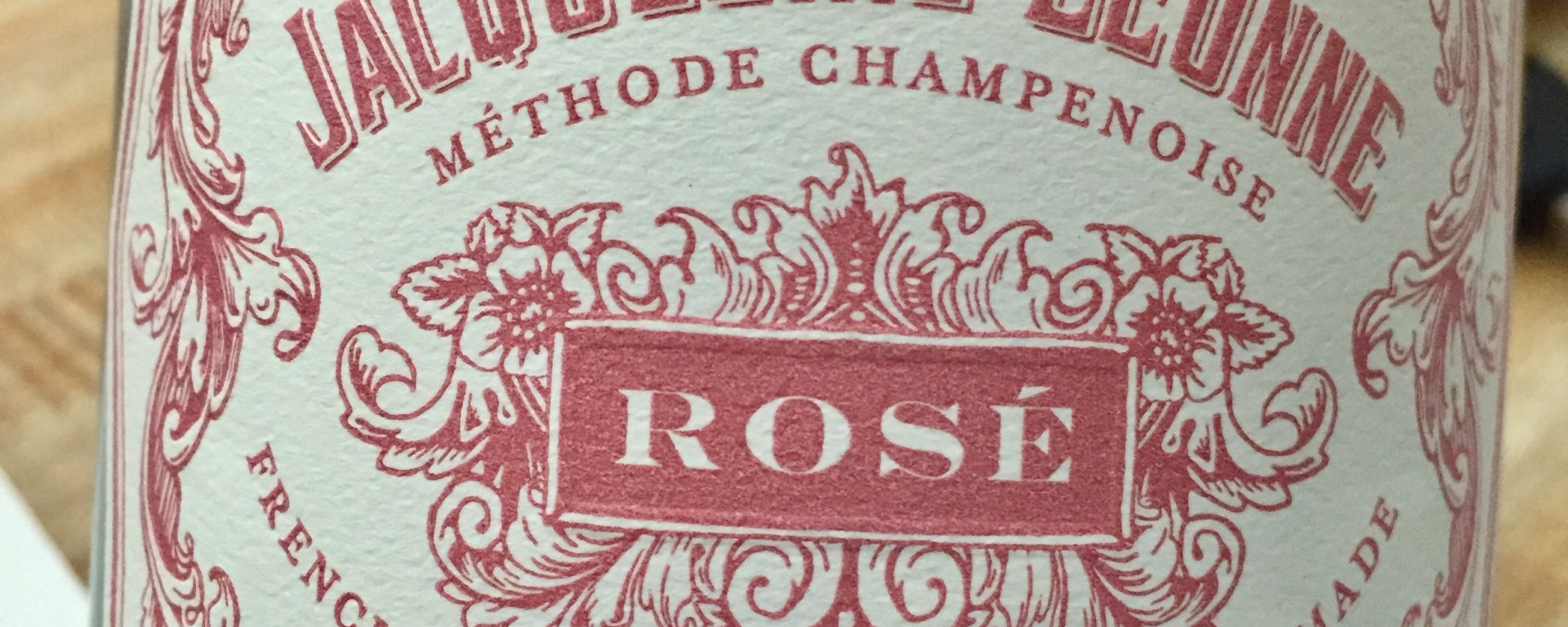 The label reads: “Jacqueline Leonne is an exceptional sparkling wine made in the true Méthode Champenoise style. 100% Pinot Noir, this crisp, food-friendly wine is perfectly effervescent with lavender aromatics, berry flavors, and a vivacious, refreshing finish. French-inspired, American-made.”