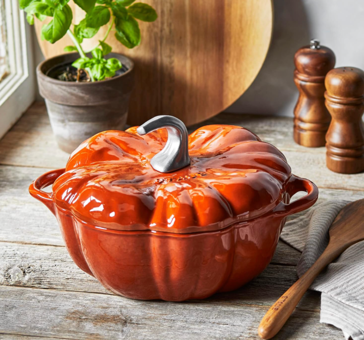 Pumpkin Cocotte STAUB Cast Iron Dutch Oven 3.5-qt with Stainless Steel Knob, Made in France, Serves 3-4, Burnt Orange – Artsy and fun cocotte for October and fall theme meals!