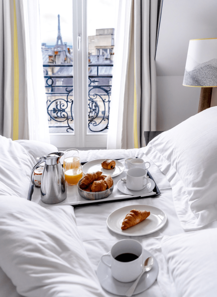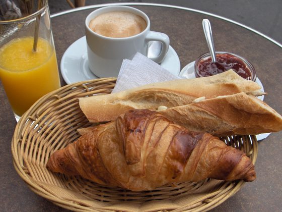 No, French people don’t eat croissants from the boulangerie every day! Instead, most French people will have des tartines beurrées ou à la confiture to dip into or pour faire trempette in a big bowl of café au lait ou chocolat chaud. Tartines are so much better than toast; they are long pieces of baguettes split in two and can be served fresh as is or as Tartines grillées. Children will often indulge in une tartine au Nutella! Coffee, of course, is strong and delicious, like Carte Noire, and often made in a French Press, served noir or au lait avec ou sans sucre.