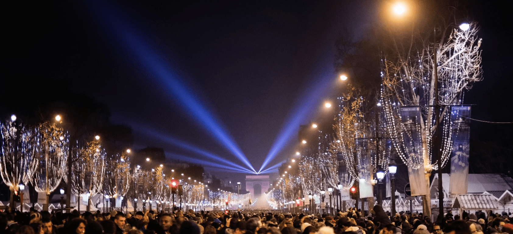 Every year in Paris, many people gather on the Champs-Élysées or under the Eiffel Tower to celebrate the arrival of the new year with fireworks. Since December 31, 2014, a sound and light show has been projected onto the Arc de Triomphe, followed by a large fireworks display at midnight (except in 2015, when they were canceled in the aftermath of the November 13th attacks, and again this year, 2025, where only a sound and light show is planned).
